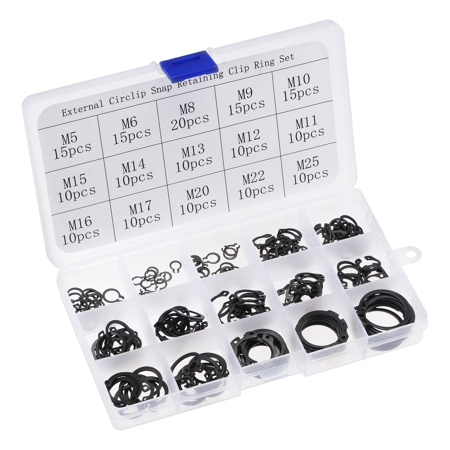 E-clips, also known as "e-rings," are used to secure parts onto a shaft. They fit into grooves in the side of the shaft for a snug fit. E-clips come in different types depending on specific application needs.